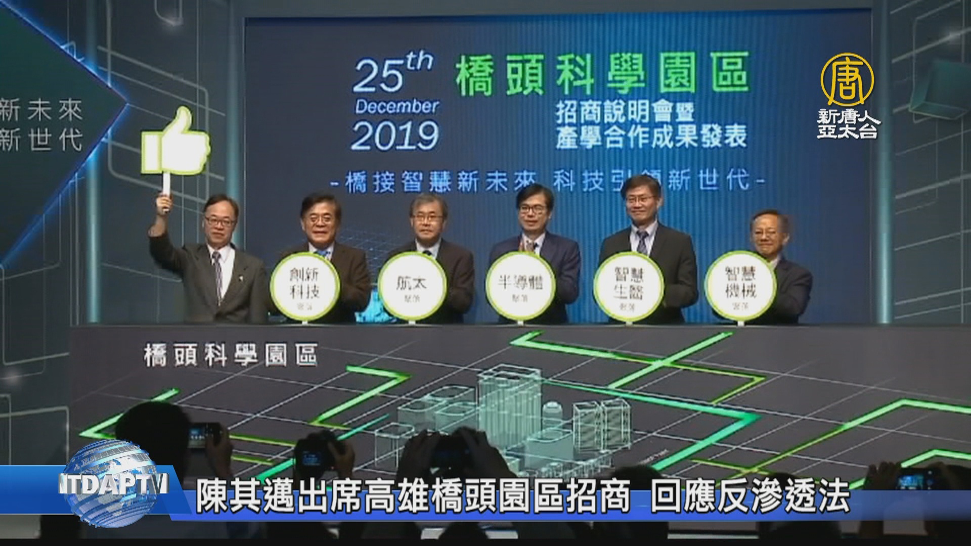 【新唐人亞太台 2019 年 12 月 25 日訊】科技部南科管理局今(25)日舉辦「橋頭科學園區招商說明會?產學合作成果發表會」,共吸引上百家廠商,超過200人參加,行政院副院長陳其邁到場宣示政府持續拼經濟的決心,受訪時回應韓市長對市民道歉和反滲透法等提問。