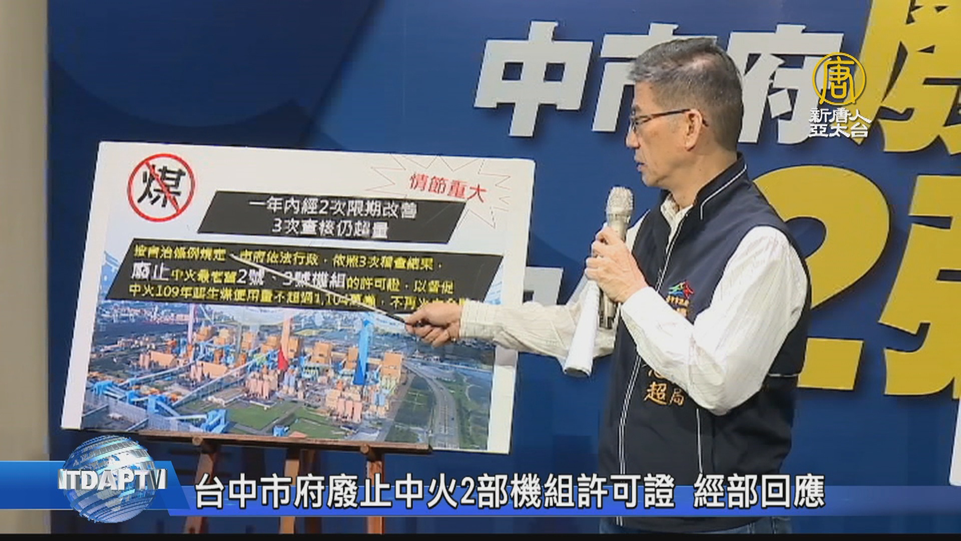 【新唐人亞太台 2019 年 12 月 25 日訊】今天(25日)上午,台中市長盧秀燕主持市府低碳城市推動辦公室的會議時,宣佈廢止中火2部機組操作許可證,創台灣首例,盧秀燕表示,中火2度生煤使用量超標,已超過1104萬公噸,違反台中生煤管制條例,情節重大。對此,經濟部與台電董事長楊偉甫都有相關回應。