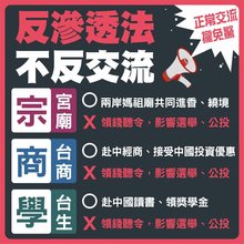 民進黨懶人包也說明,反滲透法不反交流,舉凡宗教宮廟、台生、台商,正常交流都不會觸法。