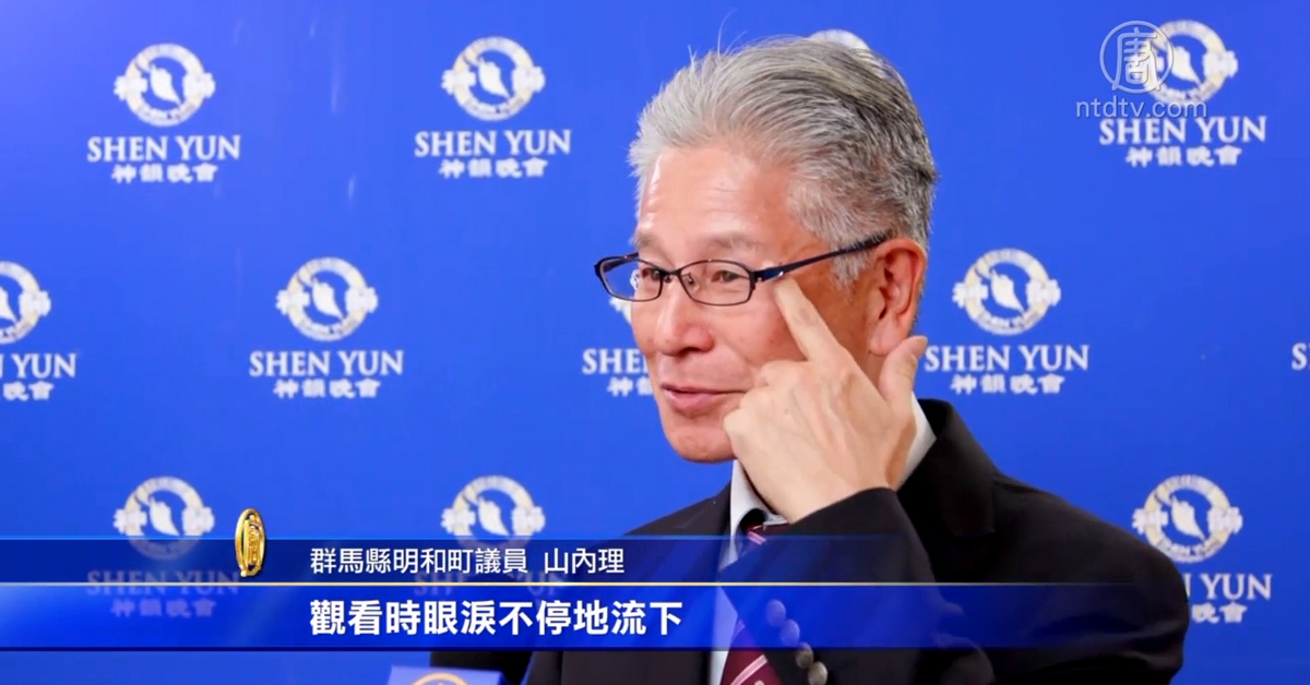 群馬縣明和町議員 山內理:「太精彩了,第一次看到如此高水準的演出。我立刻就哭了,精彩極了,觀看時眼淚不停地流下,我震驚了,沒想到今天感動到哭。我看過神韻廣告片,大家都說神韻有傳統文化之魂,看後果真如此,哭得不好意思,太美了。」