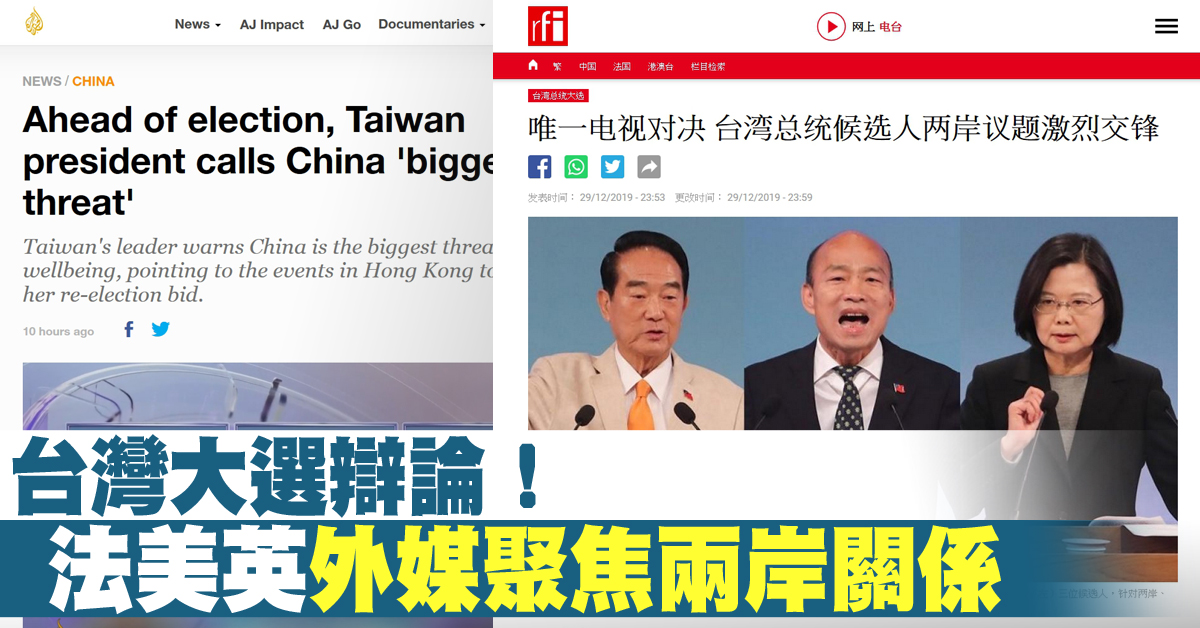 【新唐人亞太台 2019 年 12 月 30 日訊】2020中華民國台灣總統大選,唯一一場電視辯論會29日登場,半島電視台(Al Jazeera)以「在大選之前,台灣總統稱中共是『最大的威脅』」做為標題,表示兩岸關係是這場辯論會的焦點。法國國際廣播電台(RFI)、美國之音(VOA)、以及英國路透社(Reuters)都指出,香港危機、一國兩制,是這次台灣總統候選人激辯的主題。半島電視台在報導中說,蔡英文總統主張保護台灣主權不受中共影響。她主要的對手,中國國民黨的韓國瑜,希望與北京當局有更緊密的連結。
