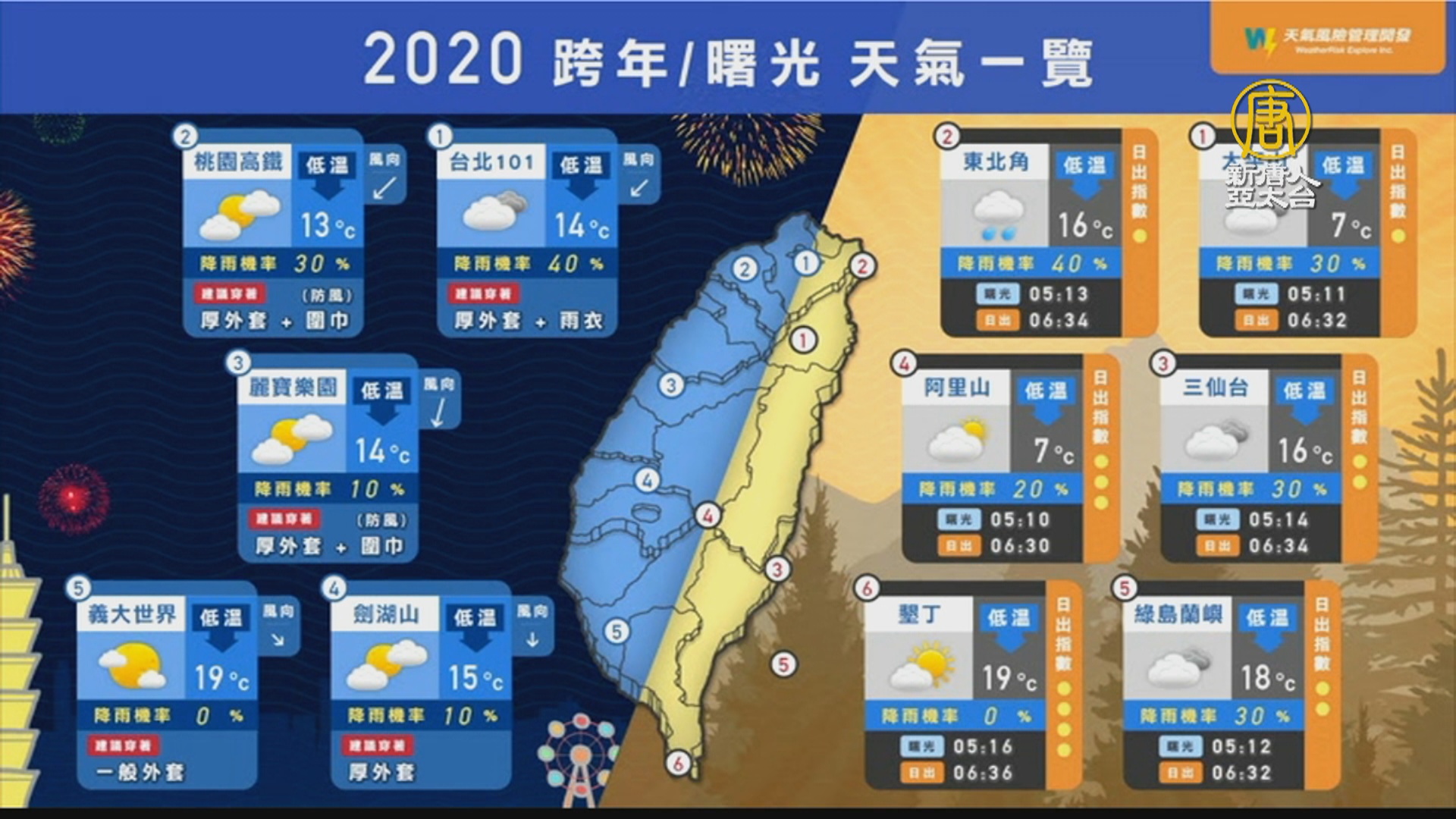 【新唐人亞太台 2019 年 12 月 31 日訊】2019年的最後一天,觀眾朋友今晚如果要出門跨年,要留意越晚越冷,中部以北,低溫在13度到15度左右,跨年夜基隆東北角、宜蘭比較有降雨機率,台北也有飄雨的機會,建議民眾可以把傘帶著,以備不時之需;而2020的第一天,星期三,天氣會由濕冷逐漸轉為乾冷,但各地仍有局部短暫雨。