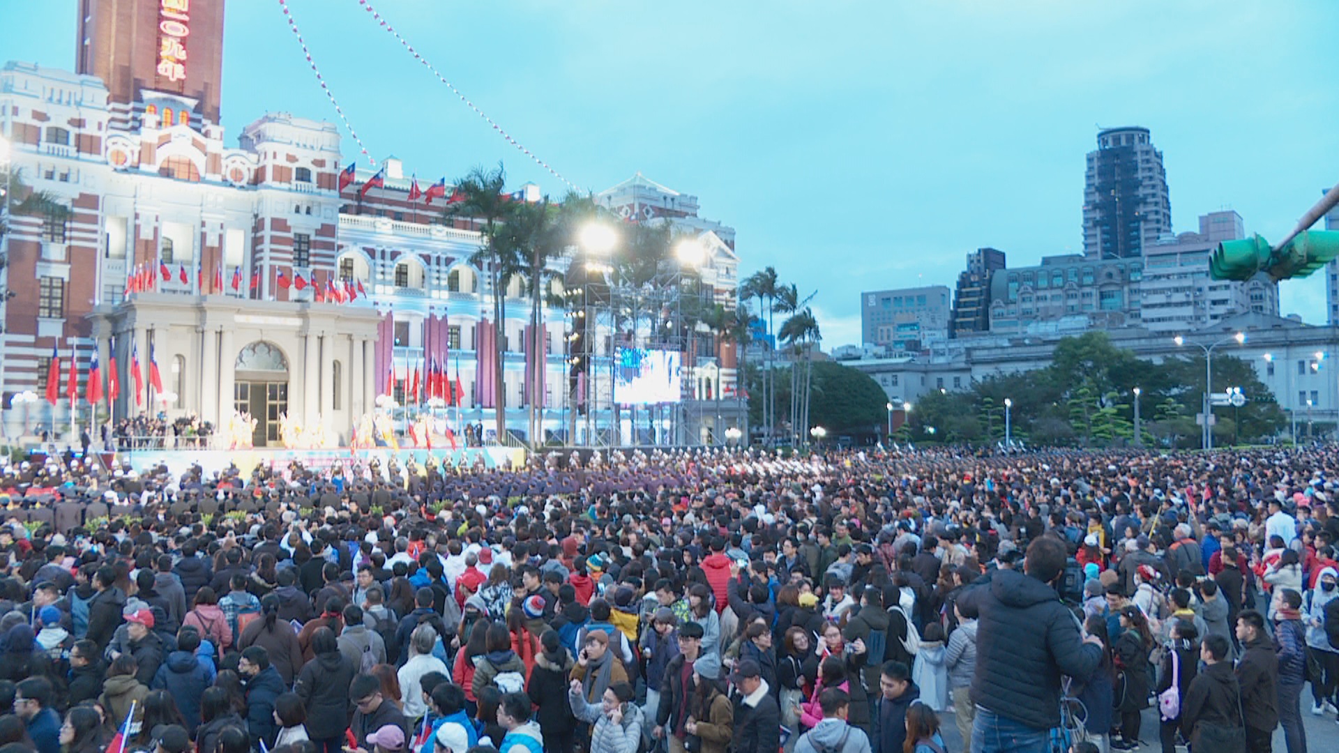 記者 李晶晶:「記者在總統府前廣場,凌晨5點多的溫度,大約14度左右,不過我們看到有非常多的民眾,聚集在這裡,來參加2020年第一天的升旗典禮。」