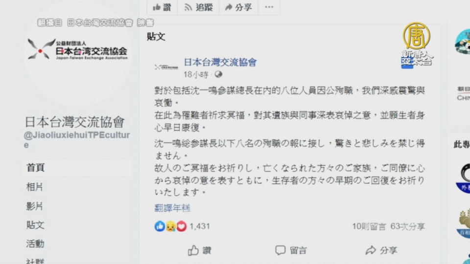 【新唐人亞太台 2020 年 01 月 03 日訊】國軍黑鷹直升機昨天重大事故,至少26國的政要與友人致哀。今天美國在台協會罕見降下半旗哀悼,日本台灣交流協會以及德國、英國、澳洲、波蘭的駐台機構,今天也紛紛發文哀悼,並祝福生還者早日康復。