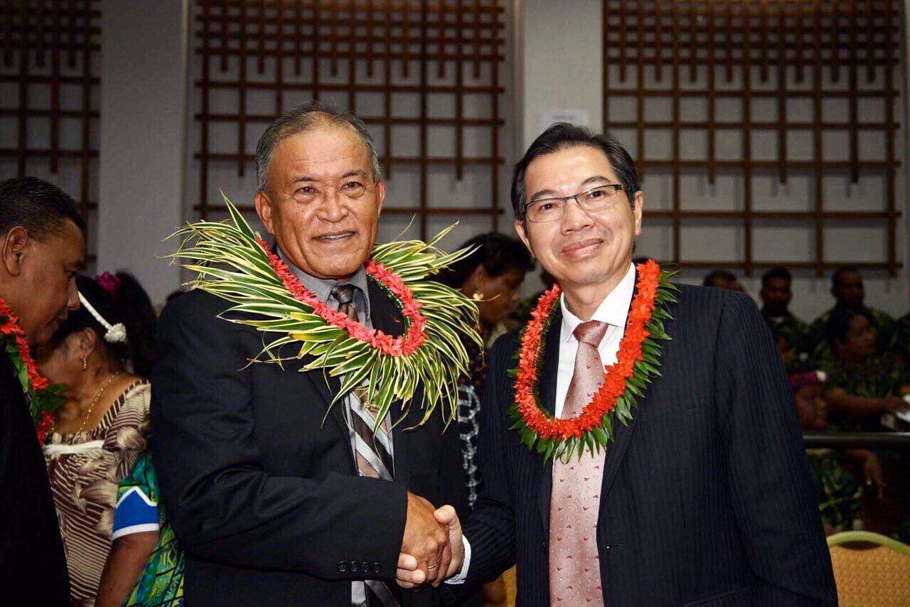 中華民國駐馬紹爾群島共和國大使蕭勝中(右)在馬國國會開議選出新總統後,向新任總統柯布亞(David_Kabua)祝賀,雙方重申臺馬邦誼穩固,將強化各領域的合作交流。 (圖/中華民國外交部提供)