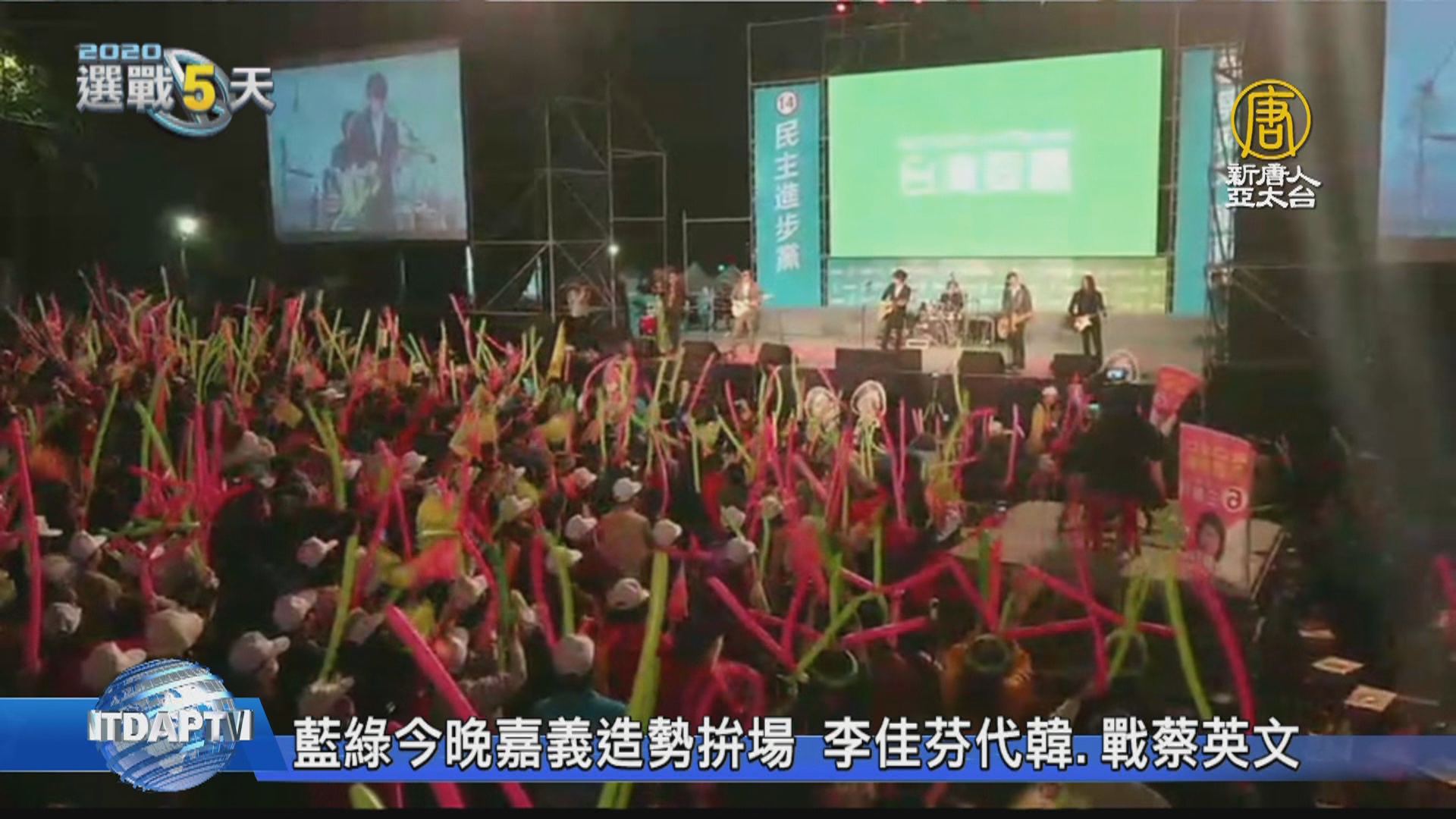 【新唐人亞太台 2020 年 01 月 06 日訊】距離投票日只剩最後5天,藍綠陣營短兵相接,今晚在嘉義市舉辦造勢晚會,兩個會場距離僅約5.2公里,警方高度戒備。藍營嘉義造勢晚會,總統候選人韓國瑜夫人李佳芬,約九點壓軸登場,而綠營造勢晚會,民進黨副總統候選人賴清德將在八點多,上台發表演說,蔡英文壓軸登場,展現大團結勝選氣勢。嘉義市警方表示,今晚2場造勢活動,動員的警力共約400人。