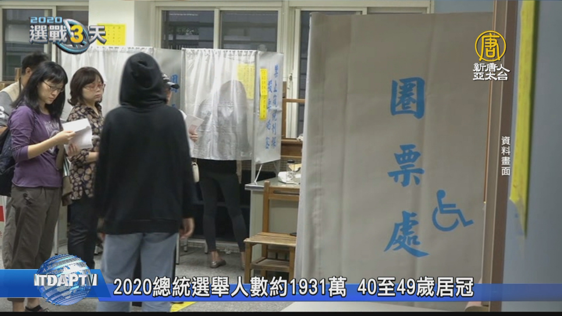 【新唐人亞太台 2020 年 01 月 08 日訊】午報頭條先來關心,這個星期六即將舉行總統大選,根據中選會公布,2020總統副總統選舉人數約有1931萬人,相較於上屆多出約53萬人,成長幅度最高的年齡層是60至69歲的選民;至於年齡層分布,則是以40至49歲居冠,共有374萬人,其次是50至59歲。中選會也表示光是6都選民,就高達1337萬人,占了總選舉人數約七成,其中又以新北人數最多。