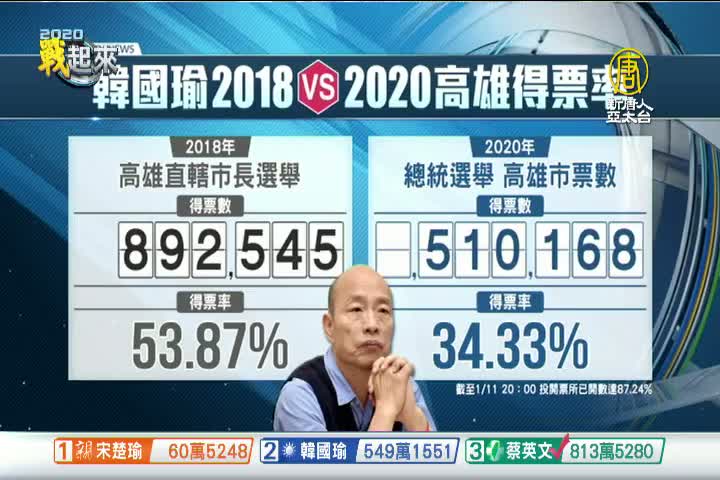 【新唐人亞太台 2020 年 01 月 11 日訊】高雄市長韓國瑜參選2020總統,在高雄的得票數也被外界視為是一年施政檢驗,來看到中選會數據。目前中選會在高雄投開票所,開票率來到87%。2018年,韓國瑜拿下89萬票,得票率53%,但目前只拿下 51萬票,得票率約 34.33%。