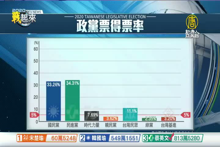 【新唐人亞太台 2020 年 01 月 11 日訊】來看到中選會,最新政黨票票數,目前台灣民眾黨的政黨票已經突破百萬,躍升第三大黨。時力也拿下百萬票,目前民眾黨得票率,11.18%,時代力量7.74%,外界看好台灣民眾黨排名第五的蔡壁如,以及時代力量排名第四的黃國昌有望進入國會。