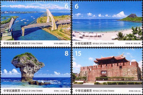 【新唐人亞太台 2020 年 01 月 13 日訊】為推展臺灣觀光,讓民眾感受臺灣豐富的景觀風貌及人文風情之美,中華郵政繼105年起發行「寶島風情」系列郵票-臺東縣、臺南市、馬祖、臺中市、澎湖縣、宜蘭縣及花蓮縣後,今年(109年)以屏東縣著名景點鵬灣跨海大橋、墾丁國家公園、小琉球花瓶岩及恆春古城等屏東縣著名景點為題材,發行「寶島風情郵票-屏東縣」1套4枚,面值分別為6元2枚、8元及15元。