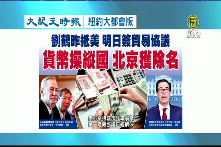 【新唐人亞太台 2020 年 01 月 15 日訊】接著看到大紀元時報紐約大都會版報導:中國國務院總理劉鶴抵達美國,15號簽署貿易協議。貨幣操縱國,北京獲得除名。