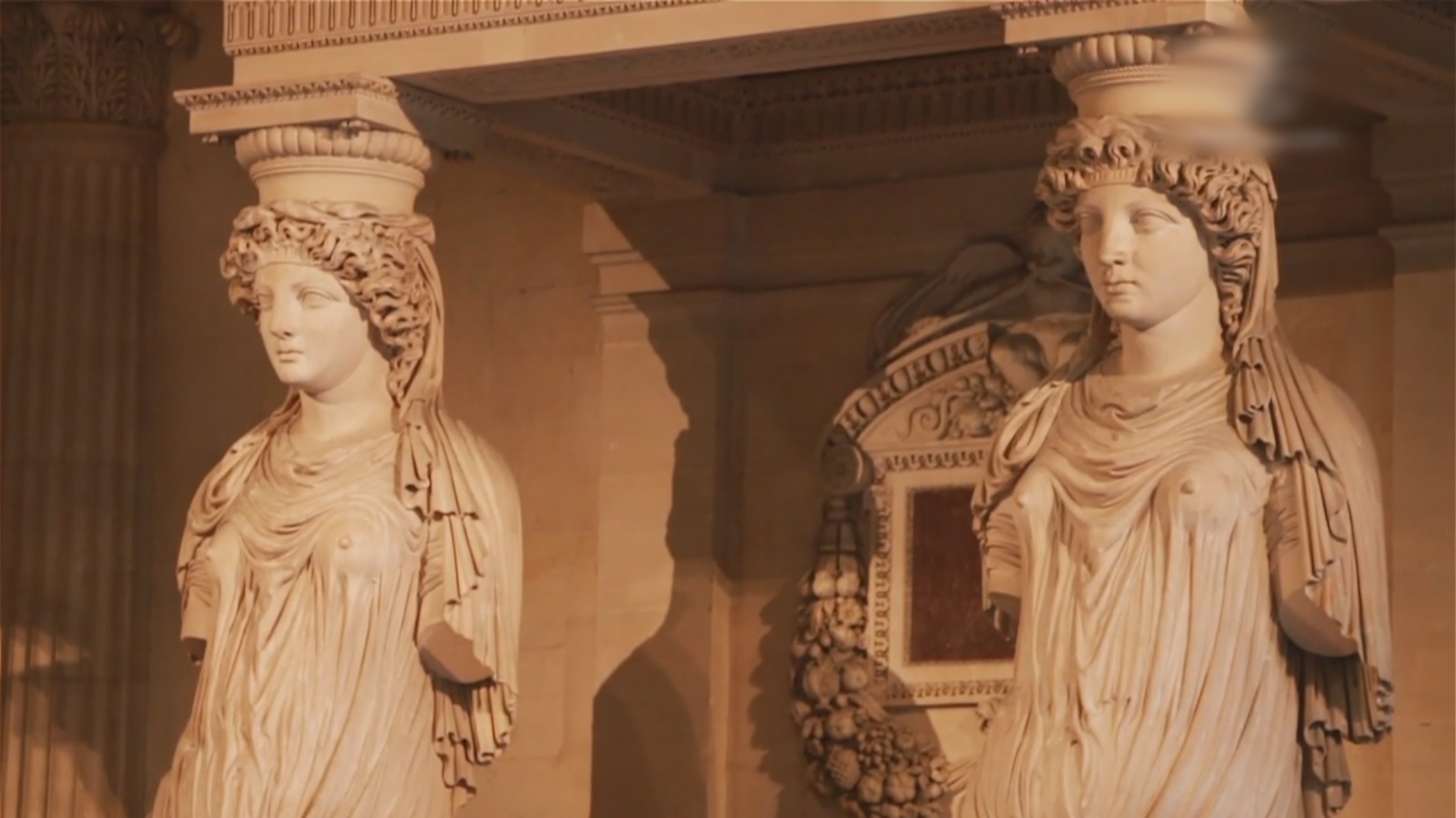 記者仁靜:這裡是卡婭第德廳Salle caryatides,1572年,也就是500多年前,這裡曾是盧浮宮的中心,在這裡您能捕捉到文藝復興時期羅浮宮的靈魂。例如這4根頭頂著音樂台的柱子,卡婭第德女像柱,展廳因此而得名。這裡展示著法國王室收藏的第一批古老雕像,都是上年前古羅馬的作品,這座是叫做黛安娜的狩獵女神,衣服皺摺和動態的表現栩栩如生,是當今盧浮宮的的核心作品之一。