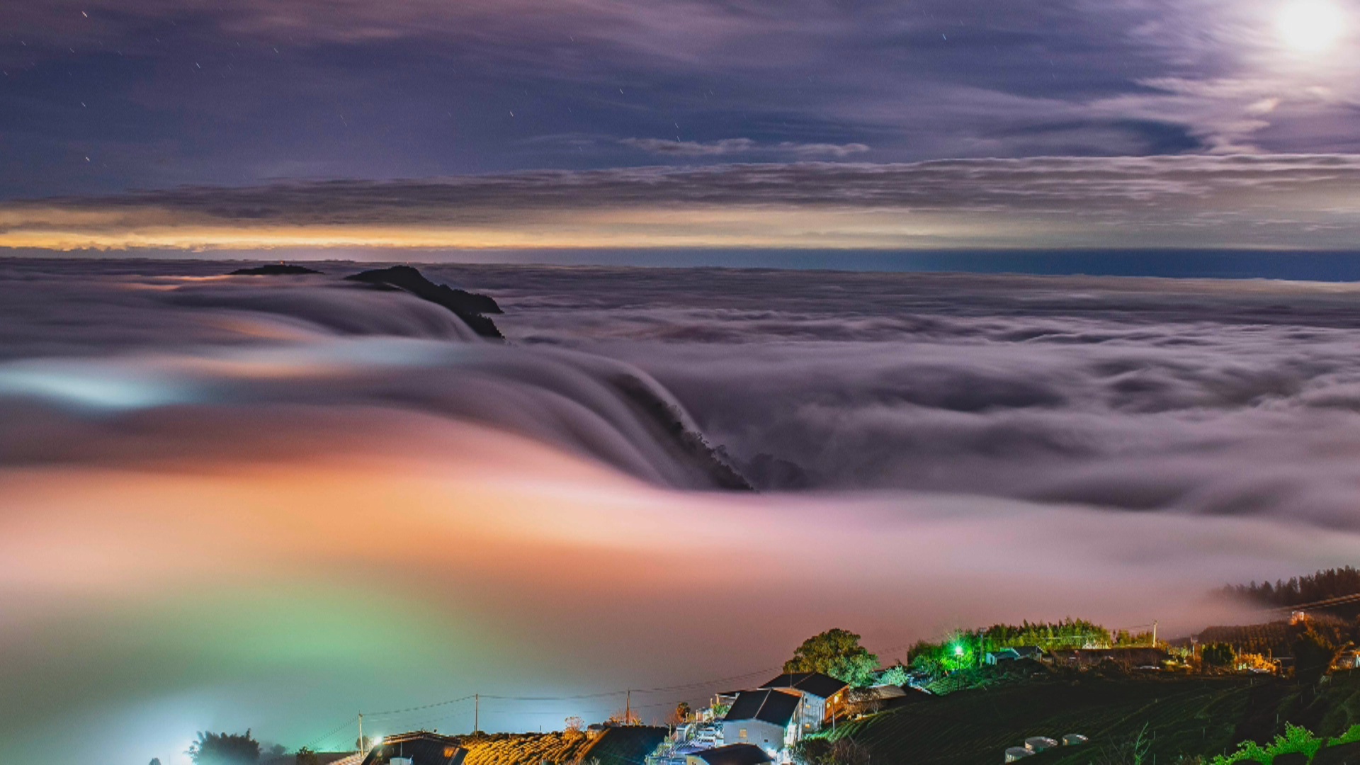 宛如絲綢般的雲海隨著山型頃洩而下,街道的路燈以及霓虹燈透過雲霧折射透映出七彩光暈,這個宛如仙境般的美景,還被網友們稱為七彩琉璃雲瀑,這裡是嘉義竹崎鄉的頂石棹,美麗難得一見的景色讓許多攝影玩家們樂此不疲前來拍攝。