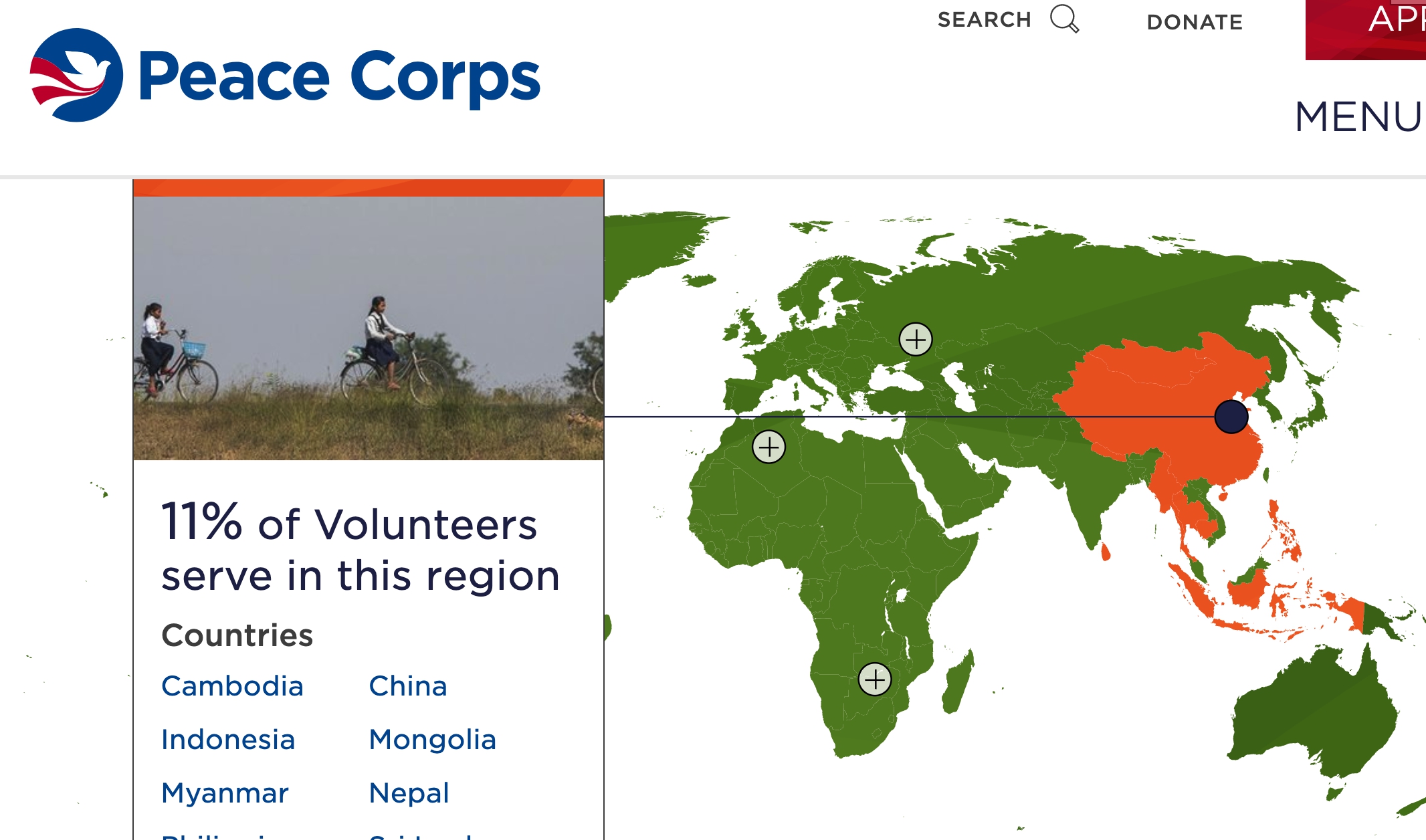 美和平工作團官網資料,約11%志工在中國大陸等地區服務。(截圖/Peace Corp網站)