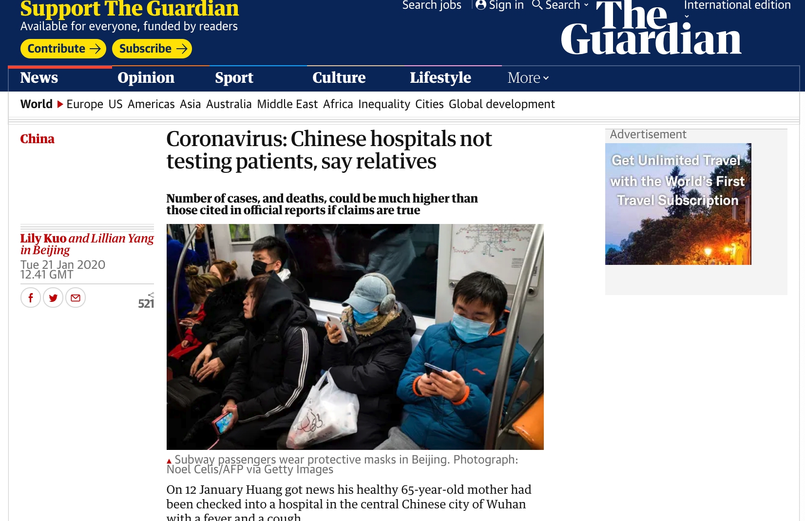 1月21日,英國三大報章之一的《衞報》報導,武漢黃先生的母親1月12日因發燒和咳嗽住院,僅僅3天後就死在醫院。醫院隨後向家屬施壓,迅速將遺體火化。