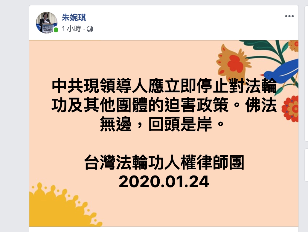 【新唐人亞太台 2020 年 01 月 24 日訊】台灣法輪功人權律師團發言人朱婉琪,24日週五除夕下午在臉書貼文,喊話勸解中共現領導人,「應立即停止對法輪功及其他團體的迫害政策。佛法無邊,回頭是岸。」