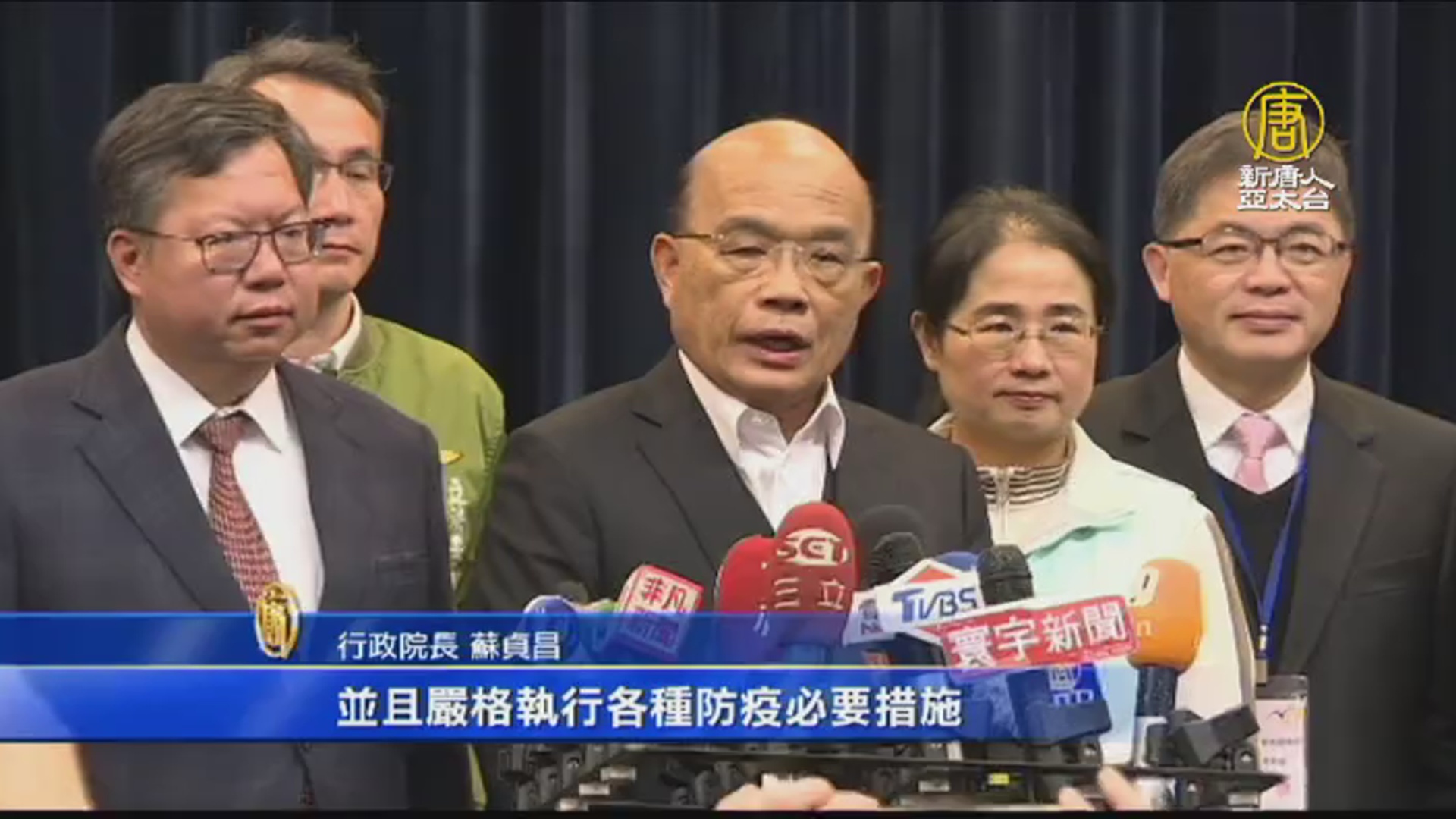 對於國內疫情,蘇貞昌表示,政府一直嚴密掌控,強調「有政府,請放心」,新發現2個確診病例,也都是有武漢旅居史,不是在台灣社區內感染,並已嚴密隔離。武漢團已經離境,台灣團也不出團到中國。