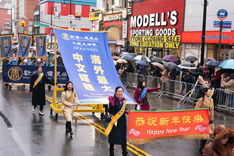 大紀元、新唐人媒體集團多語種的中西族裔員工約100人,手持「大紀元時報——良心媒體、權威感言、引領時代」、「海外最大中文電視新聞網」以及數十個金牌欄目的橫幅——包括「全球新聞」、「中國禁聞」、「世事關心」、「健康1+1」、「今日大紐約」、「傳奇時代」、「細語人生」、「笑談風雲」等,浩浩蕩蕩,一路不斷向民眾致以新年的問候。