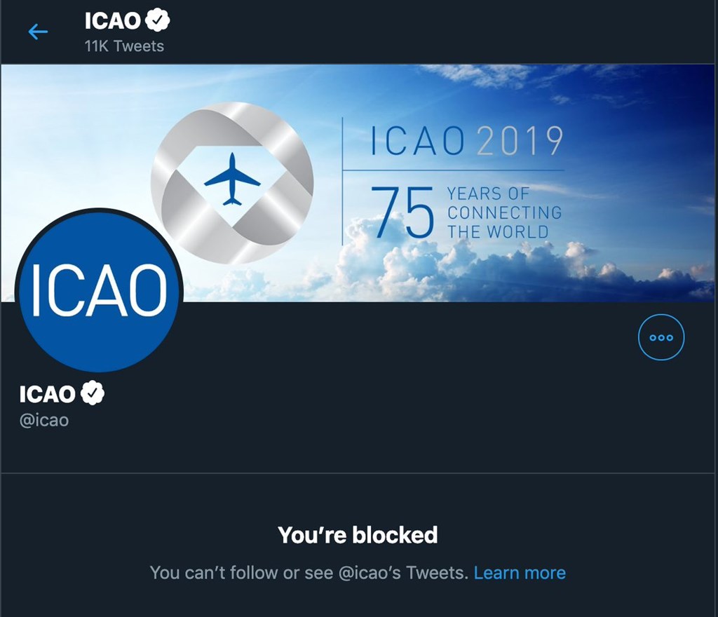 國際民航組織(ICAO)近來傳出大舉封鎖挺台灣的推特帳號,這些帳號都是在ICAO推特上表達不滿台灣遭ICAO排除的言論而遭封鎖。(圖/jessicadrun推特)