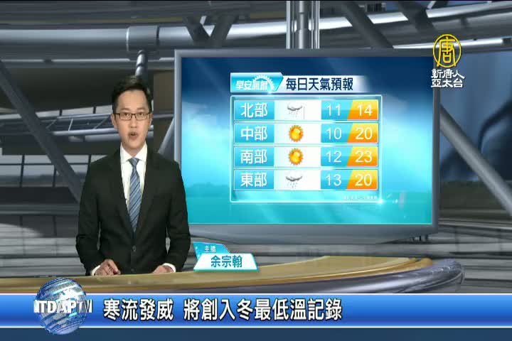 【新唐人亞太台 2020 年 01 月 29 日訊】歡迎您收看1月29日的早安新唐人,我是余宗翰,先來帶您關心今天的天氣情況。今天是大年初五開工日,受到寒流影響,今天的氣溫將比昨天更低,高雄以北地區有機會出現8至11度的低溫,氣象局已經對這波寒流首度亮起低溫橘燈警示,提醒基隆、新北、桃園民眾要特別注意保暖。帶您一起來看到國際媒體重要訊息。