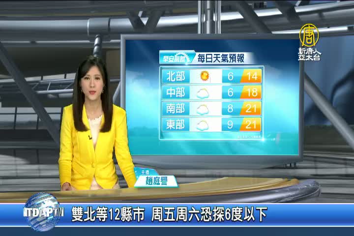 【新唐人亞太台 2020 年 01 月 31 日訊】寒流發威,氣象局昨天發布入冬以來最大規模的低溫特報,提醒20縣市今、明兩天有機會出現十度以下低溫,其中雙北等十二縣市更亮起「非常寒冷」的橙色燈號,低溫恐怕直探六度以下;氣象局表示,二月二日前,全台都要嚴防低溫。帶您一起來看到國際媒體重要訊息。