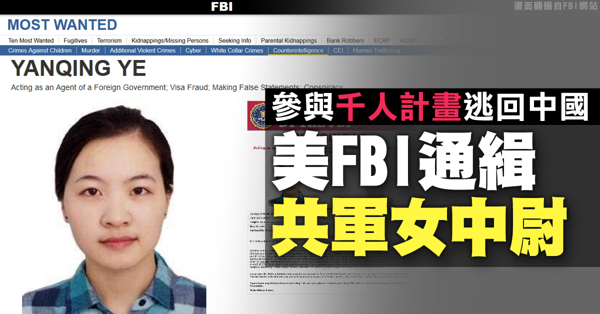 美國檢方28日起訴3名參與中國「千人計畫」學者,其中一人為波士頓大學研究人員葉艷卿(Yanqing Ye,譯音),由於美方認定葉人在中國,聯邦調查局(FBI)遂在近日發布通緝令,同時揭露她的身分其實是共軍中尉。