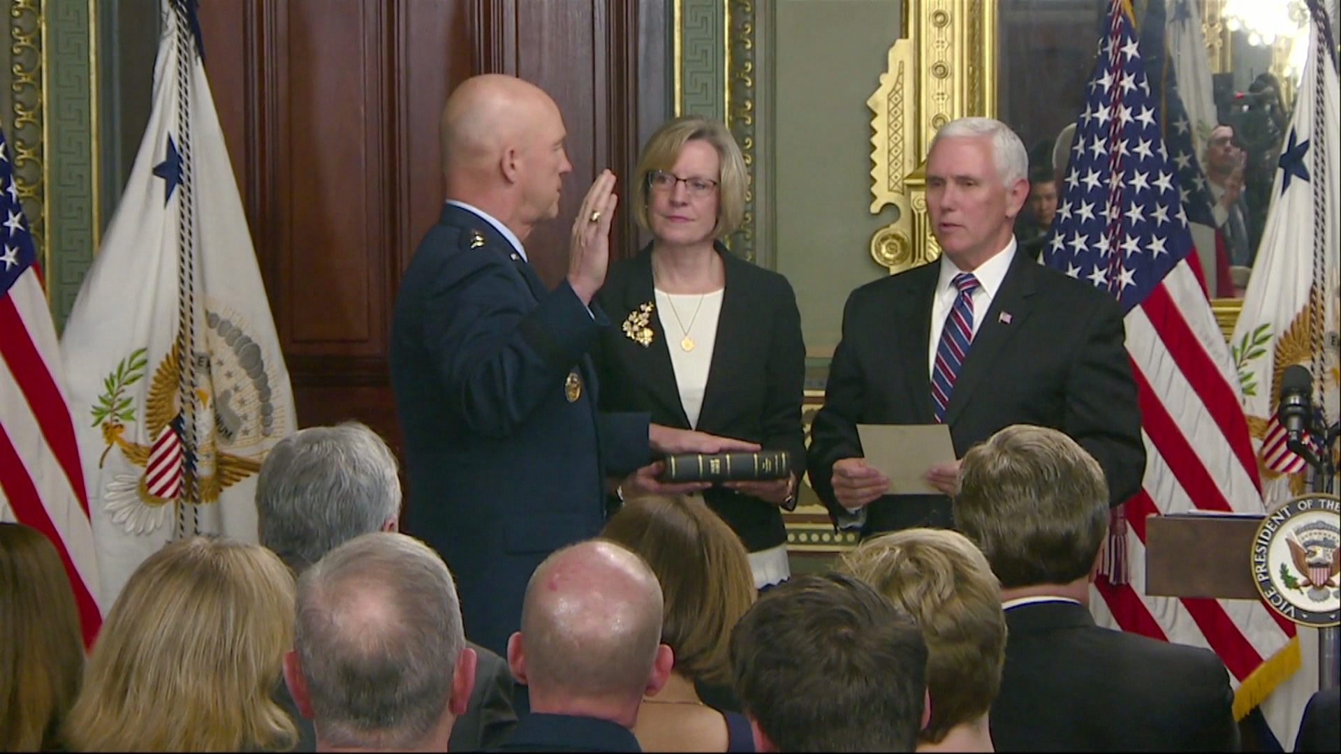 美國副總統 彭斯:「今天對我們的國家來說,是歷史性的一天,因?我們將見證美軍70多年來首個新軍種的領袖宣誓就職,太空作戰部長約翰·雷蒙德將軍。」