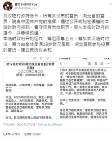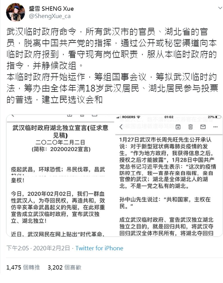 2月2日,海外知名女作家盛雪在推特上發布「武漢臨時政府湖北獨立宣言」,宣言稱:今日,2020年02月02日,我們一群血性武漢人,為奪回民權,再造共和,效仿辛亥革命武昌起義的先驅,在此鄭重宣告成立武漢臨時政府,宣布武漢獨立、湖北獨立!獨立於中共暴政之外!