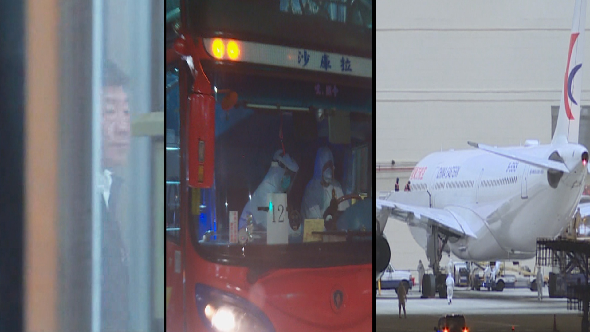 【新唐人亞太台 2020 年 02 月 04 日訊】早安新唐人,先關心,武漢肺炎疫情蔓延,500多名台灣公民滯留武漢,昨晚台商包機約在11點40分抵達桃機,疾管署大陣仗出動超過百名工作人員執行檢疫及消毒,出動遊覽車十五輛,救護車超過十輛,其他支援車輛也超過十輛。昨夜,搭載約200多名武漢台商的東方航空專機,抵達桃園機場,飛機不走空橋,而是直接進入維修棚,飛機準備消毒檢疫作業,乘客則是進行防疫檢查,若有症狀者直接送醫隔離治療,無症狀才會送隔離場所,所有返台的台商都需隔離檢疫14天。遊覽車直接在維修棚內接送乘客,司機與車長都穿隔離衣戴口罩,另外,還有台商被救護車載走,車上所有人員都穿防護衣,我們前線記者也拍到,衛福部長陳時中也親自到現場巡視。另外,陸軍第六軍團三三化學兵群偵消營,也出動5輛軍用卡車及工程車進入管制區戒備。陸委會強調,檢疫場所以「一人一室」為原則,活動範圍以檢疫房間為主,與附近居民不會有接觸,請民眾放心。