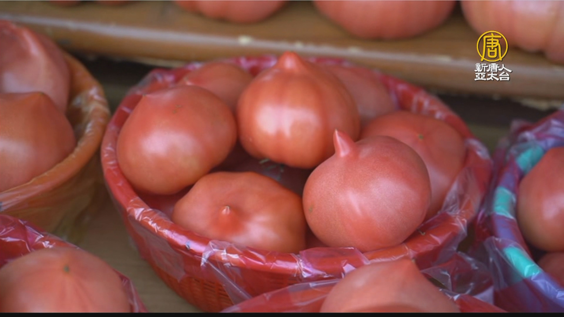 桃太郎蕃茄末端突起,造型顯眼,果農透露挑選祕訣,大的果肉多,而且綿密,小顆的話,就會連皮一起吃,口感大不同,採收季節一直會持續到清明過後。