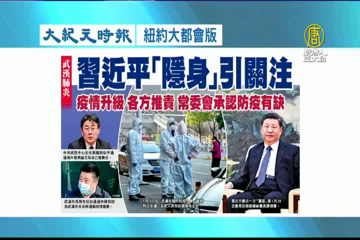 【新唐人亞太台 2020 年 02 月 05 日訊】接著看到大紀元時報紐約大都會版報導:武漢肺炎,中國國家主席習近平「隱身」引起關注。疫情升級,各方推責,常委會承認防疫有缺。