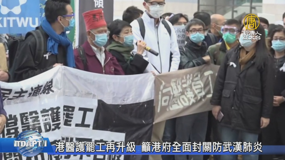 【新唐人亞太台 2020 年 02 月 05 日訊】再來看到,香港醫護罷工進入第三天,昨天香港出現首例武漢肺炎死亡病例,港府仍拒絕全面關閉大陸邊境口岸,醫護罷工升級第二階段,估計今天將超過7千人。今天(5日)上午醫管局員工陣線、醫護人員,以及多位立法會議員、區議員等約2百多人,遊行到政府總部門外請願,要求與行政長官林鄭月娥對話,員工陣線主席余慧明表示,只要港府宣布全面封關,工會將馬上號召所有參與罷工的醫護,重回崗位,與香港市民一同對抗疫情威脅。