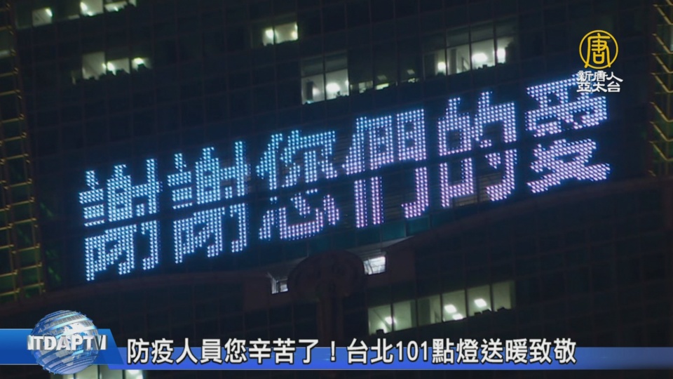 【新唐人亞太台 2020 年 02 月 05 日訊】從過年前開始,為了防範武漢肺炎,台灣防疫人員幾乎全天候,不眠不休守護國境第一線,周三晚間,台北101大樓點亮燈光,致敬感謝第一線的防疫夥伴,也請他們保重自己。台北101臉書表示,在2月5日到6日晚間6點半到10點,在建築物外牆點燈致意,為台灣加油。