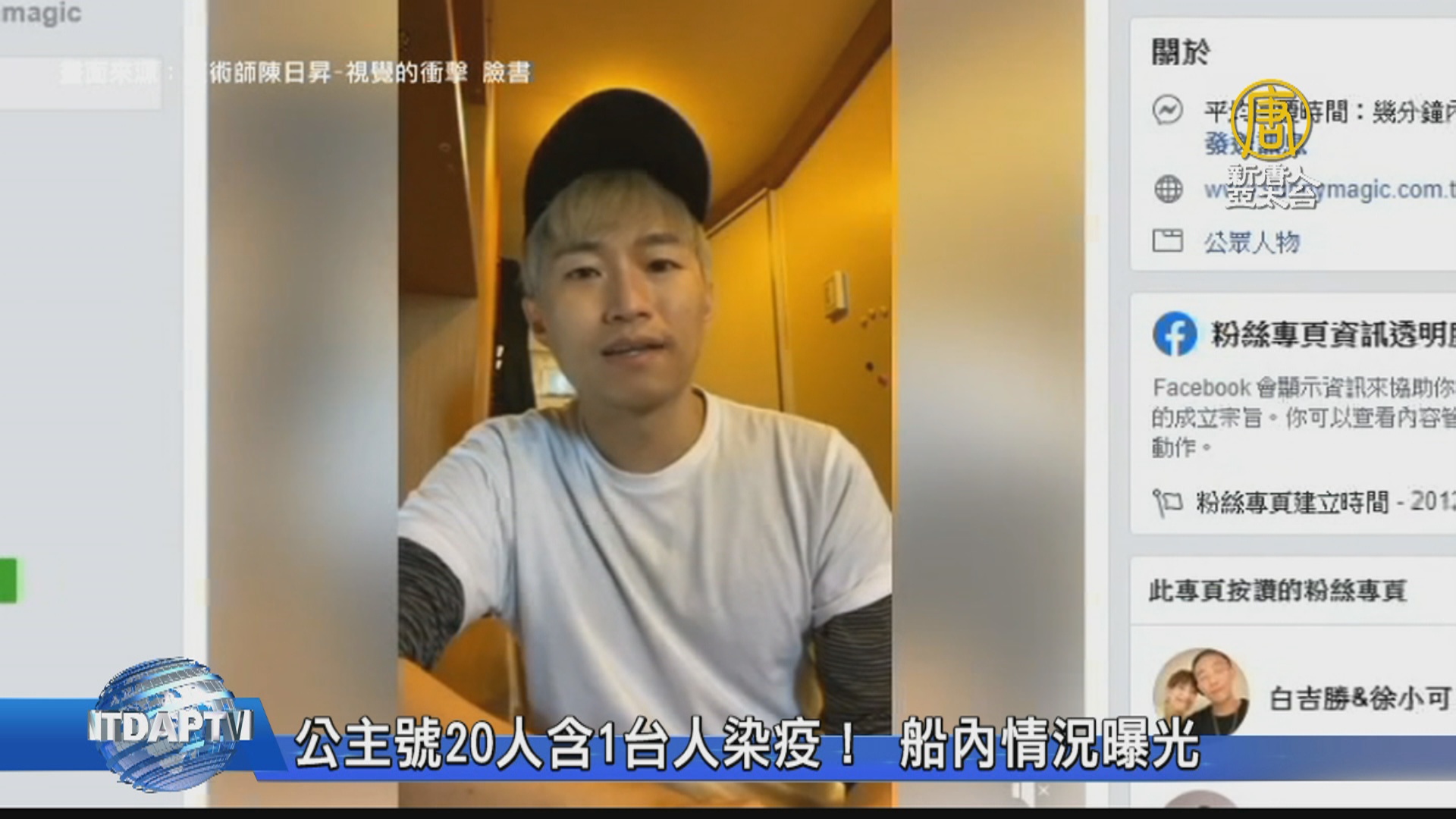 目前郵輪鑽石公主號停泊在橫濱港,約3700名船員及乘客,都得在客房內進行隔離觀察至少14天,台灣魔術師陳日昇恰巧在這艘郵輪上,周四(6日),他在個人臉書上直播船內的隔離情況,直播中多次提到「說不緊張是騙人的」,盼能早日平安回家。