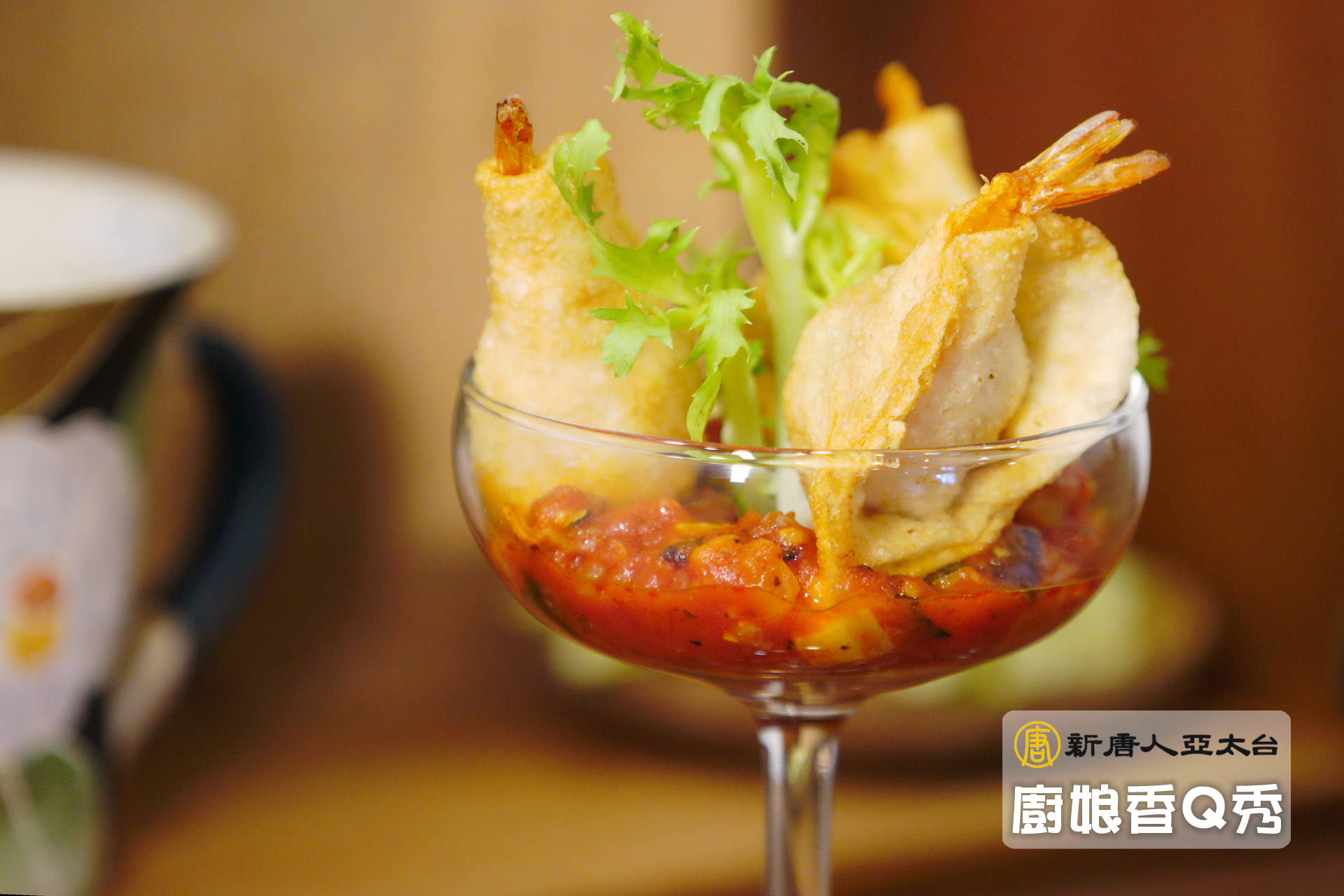 2015榮獲臺灣美食擂台賽金牌的楊天恩老師,分享黃金蝦餃佐野菜醬/酥炸軟殼蟹佐奶香黃金醬,二道佳餚都是香口鬆脆,一吃就停不了口。尤其他用酒杯的創意擺盤,更是讓大家滿滿驚喜!