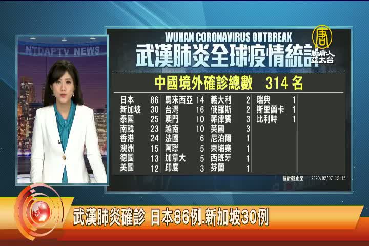 【新唐人亞太台 2020 年 02 月 07 日訊】武漢肺炎持續蔓延全球,帶您瀏覽最新的疫情資訊,目前,台灣有16例確診病例,包含港澳,在中國大陸以外,已經累計超過314例確診,分布於26個國家和地區,由於「鑽石公主號」遊輪今天再新增41起確診病例,全船累計確診達61例,也讓日本的確診人數從25人暴增為86人,但日本厚生勞動省主張船上的患者不計入日本確診。再來是新加坡30例、泰國25例、香港24例;病例中有2例死亡,分別是菲律賓及香港各1例。
