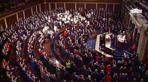 美東時間2月4日晚9點,美國總統川普在國會聯席會議上發表國情咨文演說。 (圖片來源:共有領域/白宮視頻截圖)