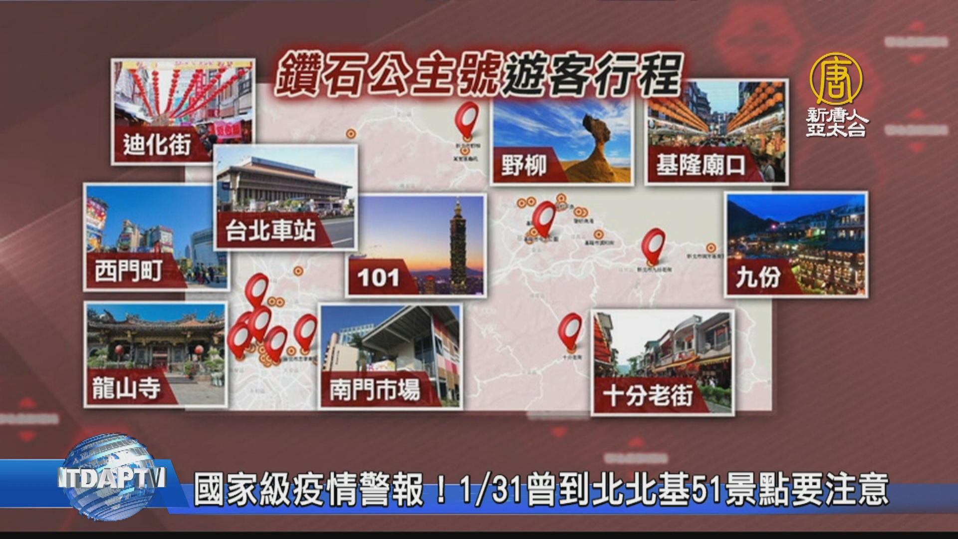 【新唐人亞太台 2020 年 02 月 08 日訊】郵輪群聚感染引發恐慌,面對鑽石公主號確診病例多,台灣政府昨天首次發布「防疫」國家級警報,公布遊客1月31日全天行程,不只台北101、南門市場、龍山寺、台北車站,就連九份、野柳、基隆廟口等51個景點都去過。疾管署呼籲,有去過這些景點的人盡量避免外出,並注意是否有發燒,自主健康管理到2月14日。