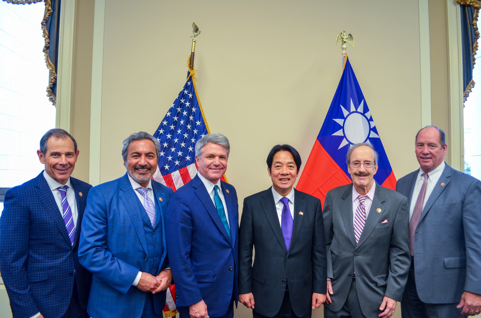 中共軍機連兩天繞台、10日還越過海峽中線,美國眾議院外交委員會官方臉書,華府時間10日貼出兩黨重量級議員與中華民國準副總統賴清德合影,背景台美兩面國旗相當顯眼。