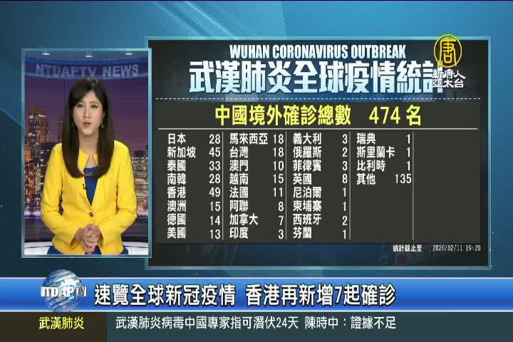 【新唐人亞太台 2020 年 02 月 11 日訊】再來帶您快速瀏覽,新型冠狀(中共)病毒肺炎的全球疫情,今天又有7個國家和地區出現新增確診,香港今天新增7起確診個案,確診累計到49例,其中一人是日前家族火鍋聚餐11人中鏢的其中一位患者的同事,而另外3起,則與疑似經糞管傳播爆發群聚感染的 長康?康美樓有關。其他則是日本新增2例,南韓、泰國、越南、阿拉伯聯合大公國、美國各新增1例。南韓官方宣布,將香港及澳門劃入新型冠狀(中共)病毒疫區中,12日起對有港澳旅遊史的入境旅客加強檢疫。