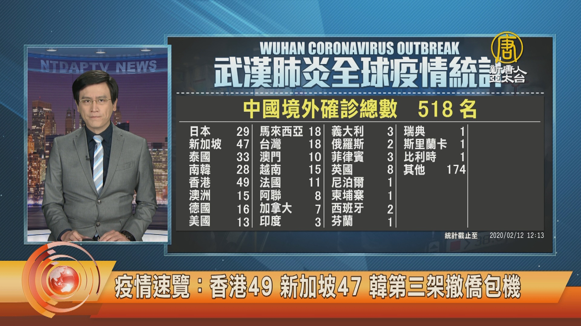 【新唐人亞太台 2020 年 02 月 12 日訊】帶您快速瀏覽,新型冠狀(中共)病毒肺炎,中國大陸境外的全球疫情,日本上午宣布,鑽石公主號再新增39人確診,全船累計174人確診感染武漢肺炎。台北時間今天凌晨,德國也新增兩起確診,累積確診來到16人。一名英國商人,在從新加坡、法國、瑞士到英國的旅行期間,將病毒傳給了至少11人被稱為是「超級傳播者」。南韓第三架從中國大陸武漢撤僑的包機,今天凌晨抵達首爾,機上有4人出現發燒症狀,需進一步檢疫。目前中國之外確診數目最多的是香港49人,其次是新加坡47人。