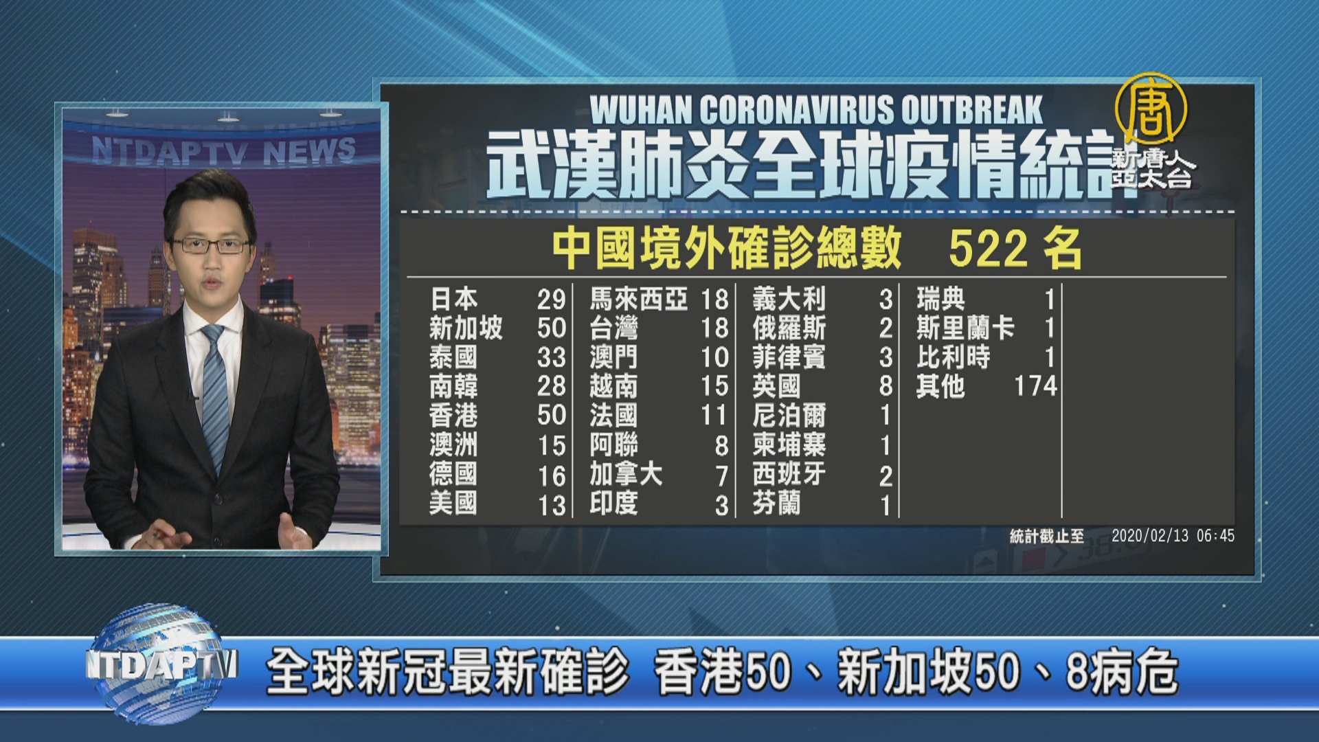 【新唐人亞太台 2020 年 02 月 13 日訊】早安新唐人,帶您快速瀏覽,武漢肺炎,Covid19病毒,在全球的確診情況,新加坡又增加三起確診個案,總數來到50人確診、8人病危。另外,香港確診人數昨天也來到50人。香港和新加坡是中國以外確診人數最多的地區。另外,日本遊輪公主號的確診人數昨天也增為174人。