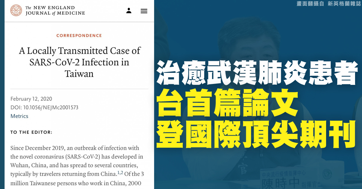 【新唐人亞太台 2020 年 02 月 13 日訊】歡迎回來,台灣力拚挺進WHO,要在國際醫療界,證明Taiwan Can Help!國際醫學期刊《新英格蘭醫學雜誌》12日刊出台灣彰化基督教醫院論文,探討台灣第一起武漢肺炎「家戶感染」本土病例,這是台灣首度發表的國際期刊文章,詳述武漢肺炎第5例感染者即使沒有明顯症狀,也會因密切接觸而傳染給家人,極具醫學探討價值。其中一名參與發表論文的醫師指出,這篇文章獲得很高的評分,證明台灣醫學水準和防疫治療,已能與全世界並駕齊驅。
