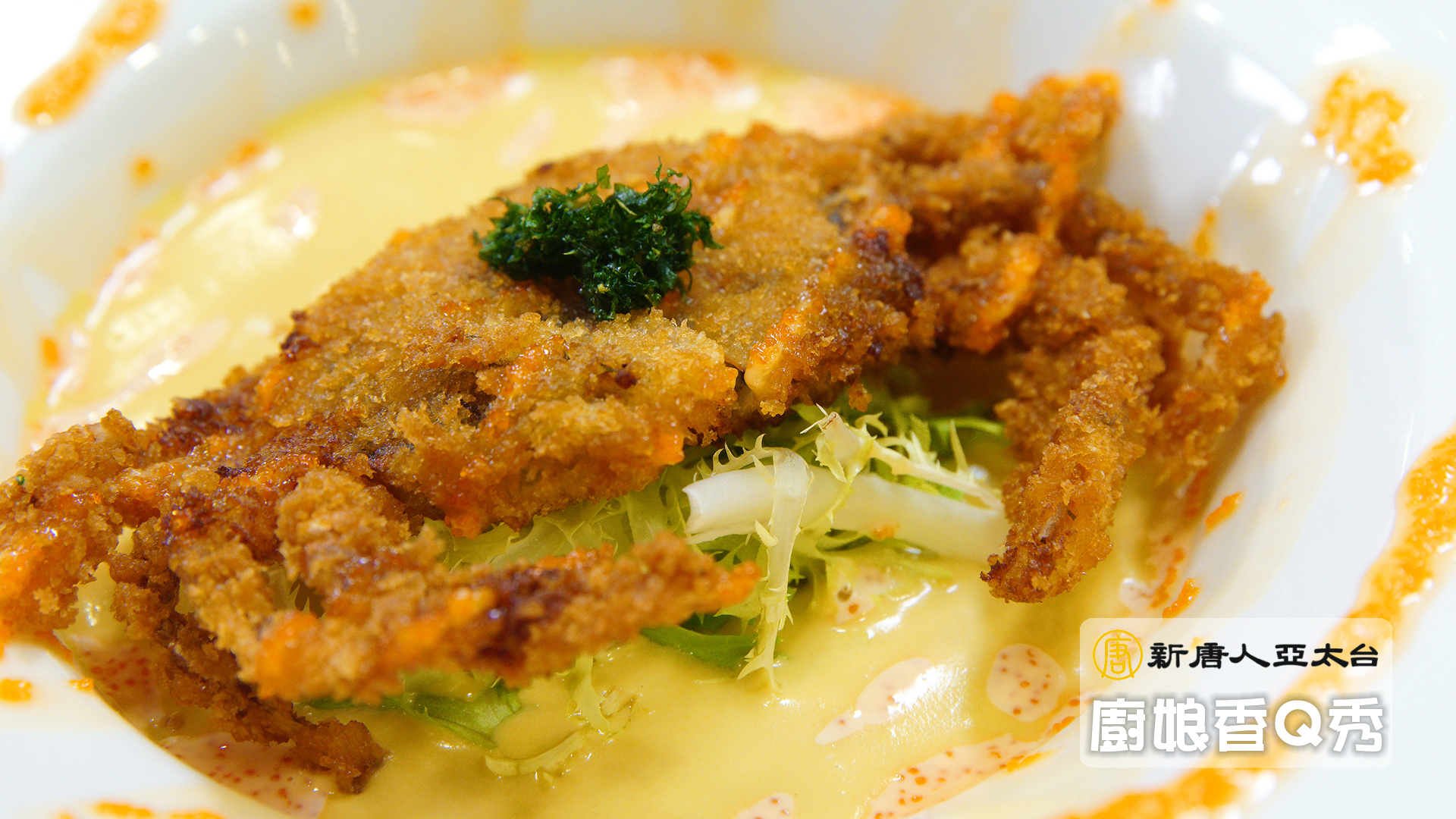 酥炸軟殼蟹佐奶香黃金醬,南瓜要連皮一起蒸,軟殼蟹要炸時,可以先把形體伸開,更可以外表香酥內部軟嫩。