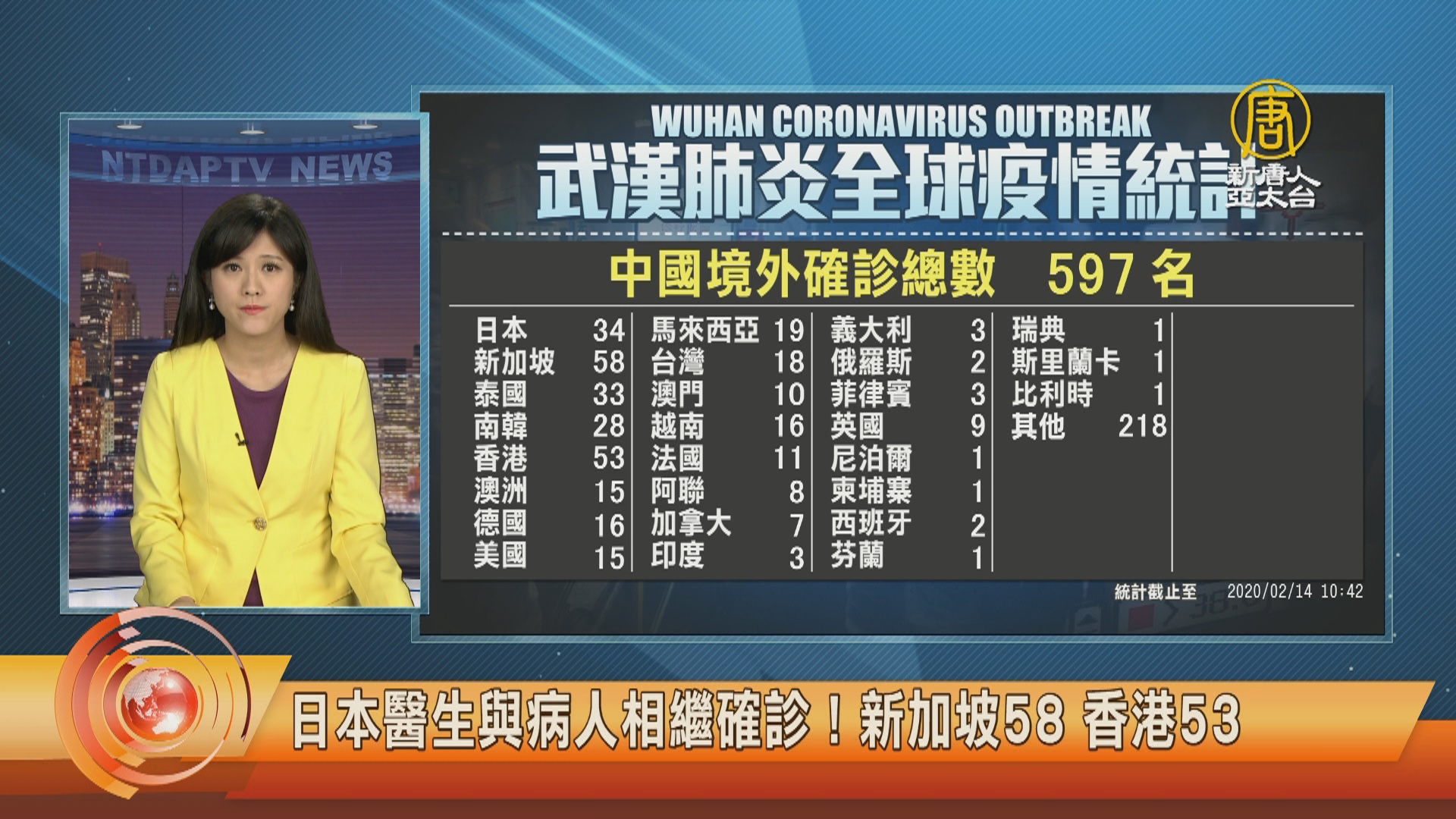 【新唐人亞太台 2020 年 02 月 14 日訊】午報頭條,先帶您瀏覽Covid-19,武漢肺炎的全球最新疫情統計,日本今天再度新增1名70多歲男性的確診病例,是昨天和歌山50多歲染病醫生同一個醫院的病患,初步排除兩人有接觸史,目前還在調查兩人的感染源頭。值得注意的是,繼菲律賓、香港有武漢肺炎死亡病例之後,日本也出現首位死亡病例。目前除了中國大陸外,國際上以新加坡58例,香港53例確診病例最多。