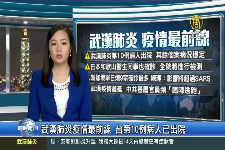 【新唐人亞太台 2020 年 02 月 15 日訊】週末火線新聞,先來快速掌握今日武漢肺炎疫情追蹤重點。武漢肺炎第10例病人已經在14日出院,其餘個案病況穩定。日本和歌山醫生同事也確診,全院將進行檢測。新加坡單日爆出9宗確診最多,新加坡總理表示:影響將超過SARS。武漢疫情蔓延,中共基層官員頻「臨陣逃跑」。