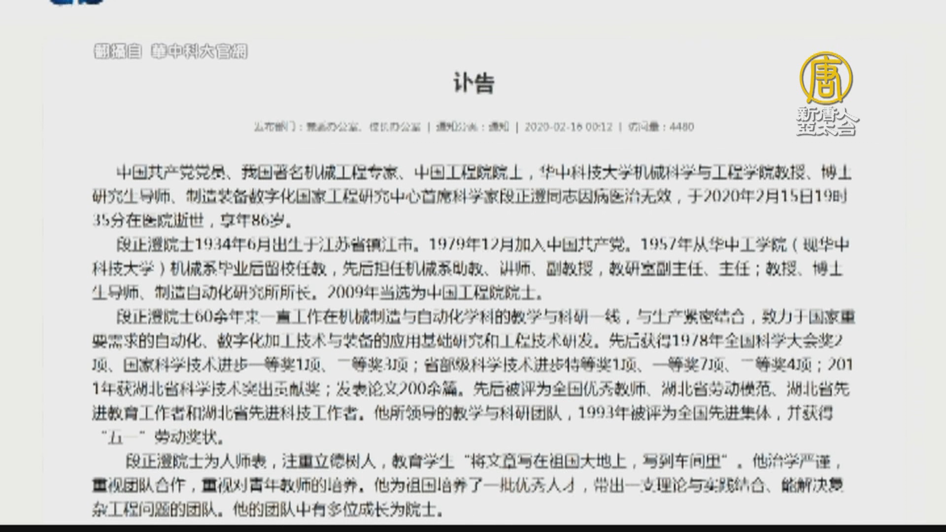 【新唐人亞太台 2020 年 02 月 17 日訊】中共肺炎快速擴散至中國各地,在中共對疫情隱瞞和封鎖下,令局面失控,相關影片及貼文不斷流出,其中一則微博貼文指出,湖北電影廠導演常凱,一家四口皆因感染肺炎相繼離世,常凱的遺書中也說到,因「位卑言輕,床位難覓」,錯失醫治良機。另外,日前華中科大紅凌教授被發布訃告,未提去世原因,不過被相關工作人員證實,因感染新型冠狀(中共)病毒肺炎。隨後,根據華中科大同濟醫院醫生介紹,教授林正斌也因感染新冠肺炎經搶救無效去世。而同校段正澄教授,16日也被發訃告,作家高伐林也在推特上發消息證實,是因新冠肺炎而逝世。這也是繼該校紅凌教授、林正斌教授之後,第三位倒下的學者。
