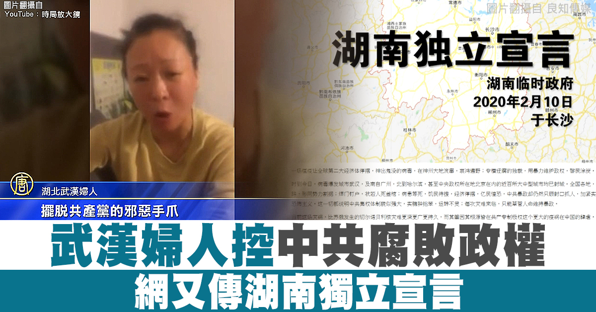 【新唐人亞太台 2020 年 02 月 17 日訊】中共肺炎疫情在中國肆虐,近日網上流傳一支影片,有一名武漢婦人自拍控訴,沒有人關心老百姓,更直言在中共邪惡政權的壓迫下,沒有人能真正地說話。另外,網上也流傳一份《湖南獨立宣言》,宣告在長沙建立「湖南臨時政府」,脫離中共暴政。