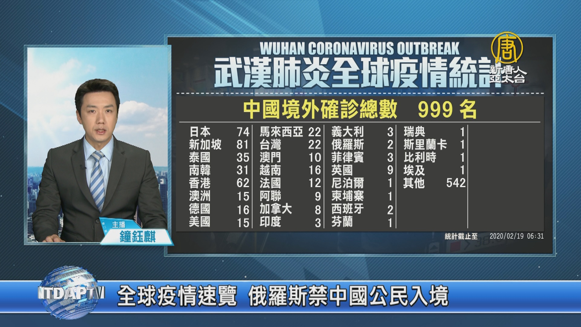 【新唐人亞太台 2020 年 02 月 19 日訊】早安新唐人先帶您快速瀏覽全球最新Covid-19 武漢(中共)肺炎疫情,截至今天凌晨,在中國大陸之外,有30個國家和地區通報確診,其中五人死亡;昨天,包括日本、新加坡、香港與公主號郵輪都有持續增加個案,其中採訪安倍的日本共同社記者,因為搭上確診司機的車子,目前已經居家隔離觀察中;另外俄羅斯18日最新宣布,將從2月20日起,暫時禁止中國公民入境。目前,俄羅斯發現的2例中共肺炎案例,都是中國人。全球有50多個國家和地區對過境中國的人,實行旅行限制和收緊簽證要求。