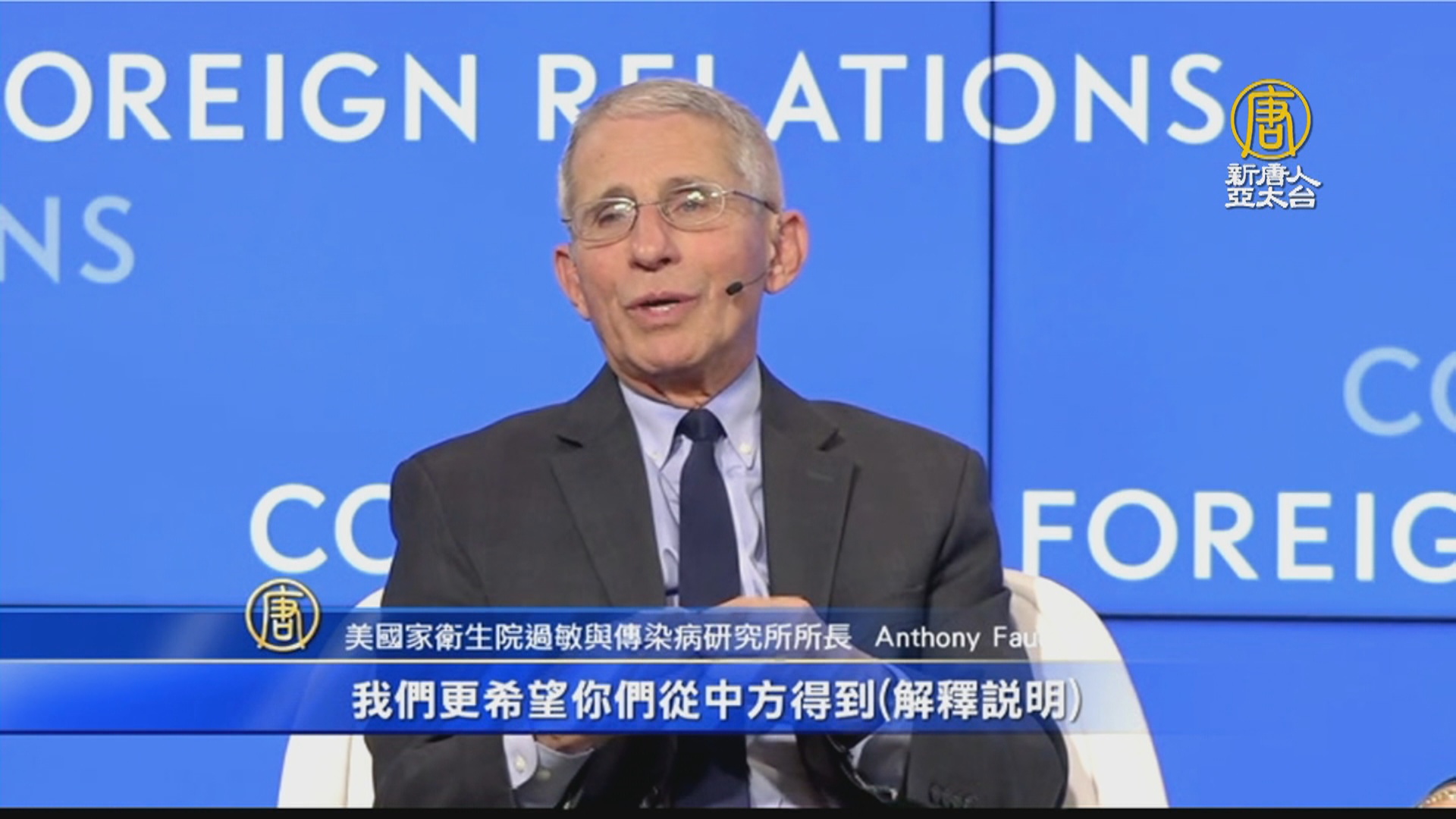 美國家衛生院過敏與傳染病研究所所長 Anthony Fauci:「我們更希望你們從中方得到(解釋說明)。我們不想跳到中方前面去,因為我們不想他們徹回對我方專家的邀請。」